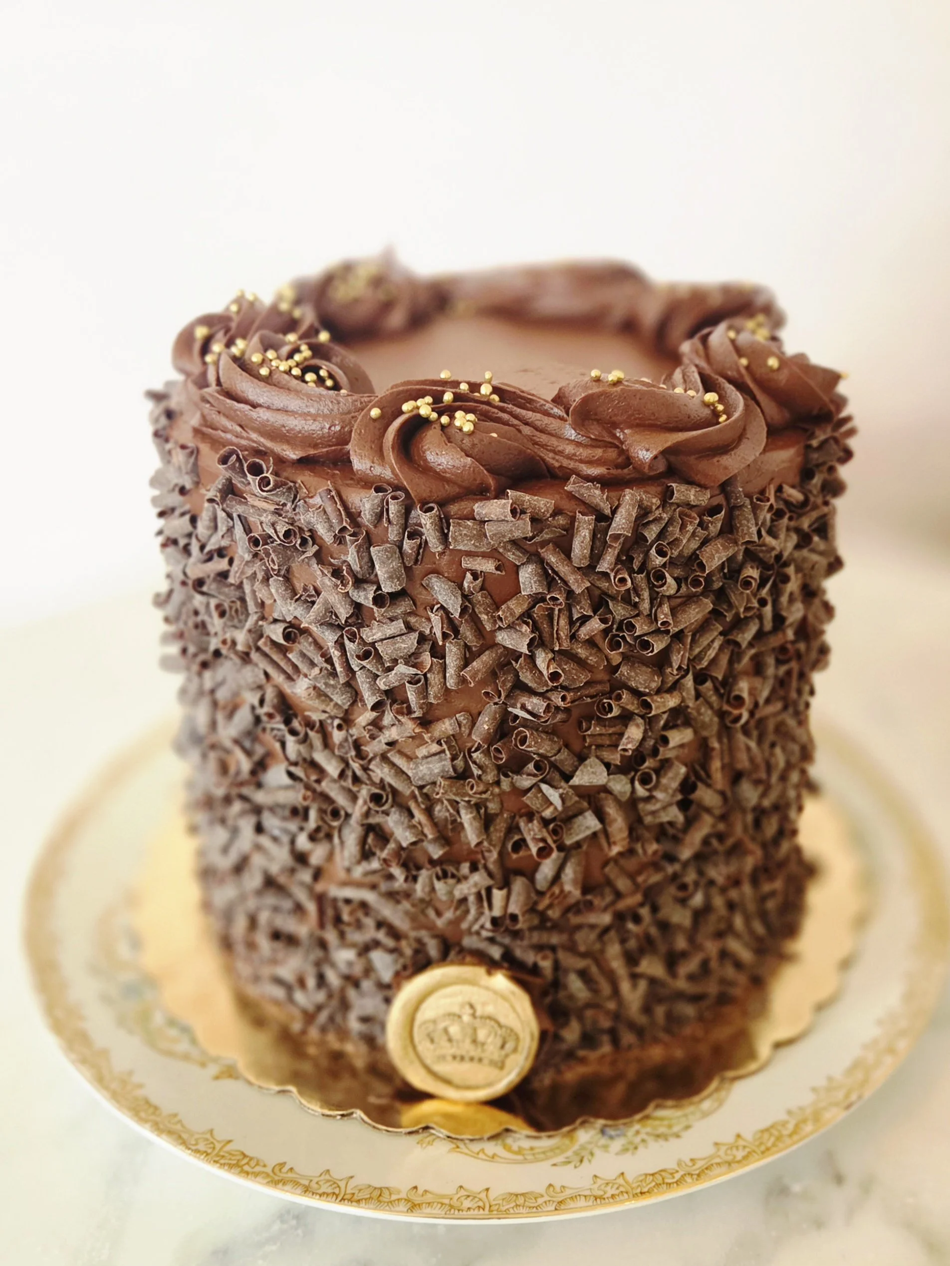 Layers of Flourless Souflee Cake with Dark Chocolate Mousse and Fresh Raspberry Filling. Iced in a Dark Chocolate Ganache with Fresh Raspberries, Chocolate Curls, and Gold Accents